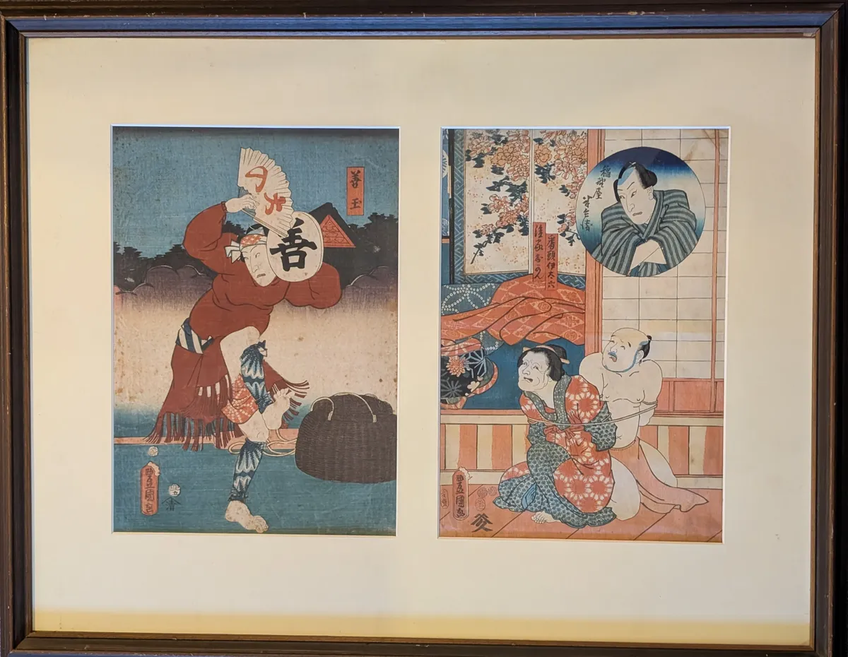 A pair of original late 18th early 19th century Japanese Woodblock prints by Utagawa Kunisadall 1 (1786 - 1865) Both after the Kabuki Theatre characters, the bound couple known as the Hostages. The left had charater is 'Akudama, Portrait of a folk actor' reputedly created in 1855. (£550)